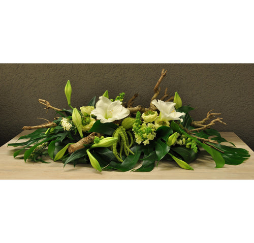 Blz. 32 | Ovaal seringenhout afscheidsarrangement wit & groen