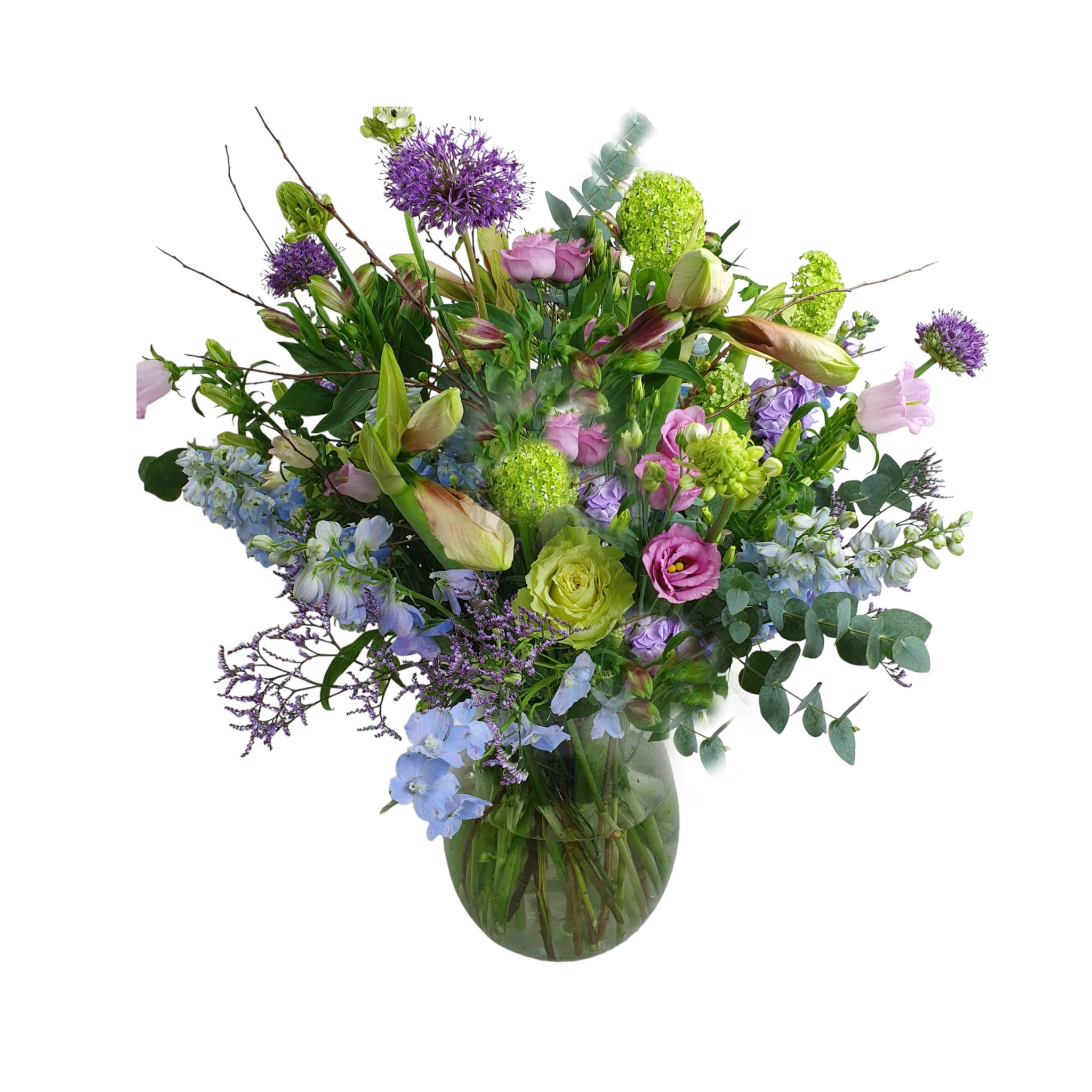Een fris en stijlvol boeket met een natuurlijke uitstraling. Dit rond opgemaakte arrangement is samengesteld met een mix van bloemen in zachte tinten van paars, roze, blauw en groen. De combinatie van seizoensbloemen en luchtig groen zorgt voor een levendig, maar rustig geheel dat in elke ruimte tot zijn recht komt.
